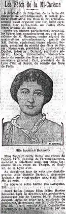 - Les reines de la Mi-Carême, Le Petit Parisien, 6 février 1921, page 2, 2e colonne.