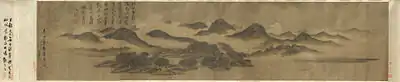 - Brume à la dérive entre les montagnes au bord d'une rivière, encre et couleurs légères sur soie, rouleau en longueur, poème du peintre daté 1130, colophon de Wang De XVIIe siècle, sans doute une copie.