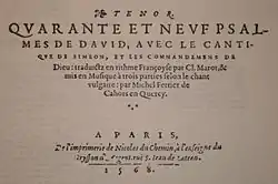 - En 1559, il publie Quarante et neuf psalmes de David, avec le cantique de Simeon, et les Commandemens de Dieu : traduitz en rime françoise par C. Marot, et mis en musique à trois parties selon le chant vulgaire par Michel Ferrier de Cahors en Quercy. – Lyon : Robert Granjon, 1559. – 3 vol. 8° obl, musique, caractères de civilité. Den Haag KB : 1708 G 32 (partie de Tenor seule)[1].