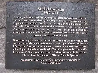 - Une plaque sur le mur extérieur de l'hôtel-Dieu de Québec[36] rappelle Sarrazin ; il y est dit qu'il est « considéré comme le premier scientifique canadien[12] ».