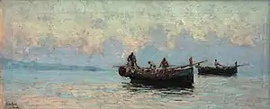 Marina con barca e pescatori. Non daté. Huile sur toile, 29 × 53 cm, collection privée.