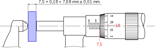 Un tour du tambour représente, en général, un demi-millimètre (0,5 mm), les graduations sur la ligne de foi sont alors espacées de 0,5 mm. A la valeur lue directement sur le corps, il convient d'ajouter la valeur lue sur le tambour gradué en 50 divisions ; 1/50 de tour de tambour correspondant à un déplacement de 1/100 de mm ( ).