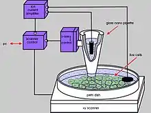 - Lors d'une mesure SICM, la micro-pipette ne touche jamais la surface de l'échantillon ; cela permet la caractérisation d'échantillons souples (cellules, échantillons biologiques, microvillosités) sans les déformer[8],[9],[10].