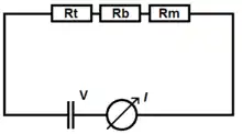 - Rb : résistance de la solution d'électrolytes entre l'entrée de la pipette et l'électrode dans le réservoir[5] ;