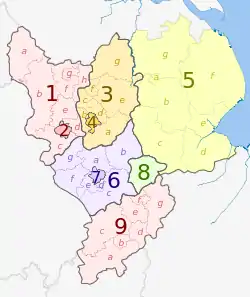 ![]() | Derbyshire | 1. Derbyshire CNM | a) High Peak, b) Derbyshire Dales, c) South Derbyshire, d) Erewash, e) Amber Valley, f) North East Derbyshire, g) Chesterfield, h) Bolsover |