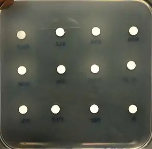 - soit le milieu est solide et présenté en boîte de Petri. Après ensemencement, on place des disques de glucides ou d'autres sources de carbone à étudier. Observer alors la culture ou non autour du disque.