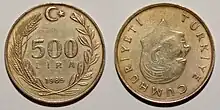 Pièce de 500 livres turques à l'effigie de Mustafa Kemal Atatürk, de millésime 1989.