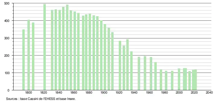 L'évolution du nombre d'habitants est connue à travers les recensements de la population effectués dans la commune depuis 1793. Pour les communes de moins de 10 000 habitants, une enquête de recensement portant sur toute la population est réalisée tous les cinq ans, les populations légales des années intermédiaires étant quant à elles estimées par interpolation ou extrapolation[14]. Pour la commune, le premier recensement exhaustif entrant dans le cadre du nouveau dispositif a été réalisé en 2008[15].