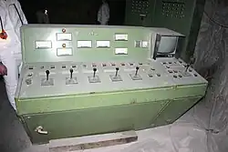 Pupitre de commande des grues pour le stockage des fûts de déchets de moyenne activité. L'écran à droite donne l'image de l'espace 8a. - 1 293 colis de déchets de moyenne activité sont stockés entre 1972 et 1977 dans l'espace 8a au niveau 511 m. Comme colis, on n'autorisait que des fûts cylindriques de 200 l ; les matériaux devaient être incorporés dans du béton ou du goudron. L'activité totale déclarée au moment du stockage se monte à 2,8 × 1015 Bq. Plus de 97 % des colis (c'est-à-dire plus de 90 % de l'activité totale d'Asse) proviennent de l'usine de retraitement de Karlsruhe. Une partie de ces fûts contient des déchets du retraitement proprement dit, et donc des matières fissiles. Les limites par fût étaient de 200 g d'U-235, 15 g d'U-233 et 15 g de Pu-239. Ces valeurs limites n'ont pas été atteintes : les valeurs maximales ont été de 24 g d'U-235, de moins de 1 g d'U-233 et de 5,7 g de Pu. Il a donc été estimé qu'au niveau 511 m, moins de 25 kg d'uranium et 6 kg de plutonium sont présents[12],[14]. En , le Ministère fédéral de l'Environnement, de la Protection de la nature et de la Sécurité nucléaire a fait savoir qu'en raison d'une « erreur de recopie », la quantité enregistrée de plutonium avait été annoncée bien trop faible, et qu'en réalité 28 kg ont été stockés[15],[16]. Une nouvelle vérification de l’inventaire fait ressortir en 2010 en tout 14 800 colis non déclarés. Ce ne sont pas comme on le croyait jusqu’à présent environ 1300, mais 16 100 colis de déchets de moyenne activité qui sont stockés[17].