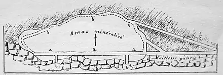 Lorsque les mineurs rencontraient un filon, ils enlevaient tout le minerai accessible : s'il restait horizontal, les chantiers d'extraction étaient très étendus ; lorsque les minéralisations se prolongeaient en profondeur, les différents niveaux du chantier se superposaient, reliés par des galeries labyrinthiques. Les mineurs veillaient à toujours suivre le contact en creusant des galeries qui montaient et descendaient suivant les caprices de son tracé. Quand ils découvraient un amas très important de minerai dans des cavités de grande taille, ils commençaient par creuser une galerie de reconnaissance de part et d'autre de l'amas (notée a sur le schéma ci-contre), complétée par des sondages vers le bas et le haut (b sur le schéma). S'il s'avérait que l'essentiel du minerai se trouvait sous leurs pieds, ils dégageaient tout le minerai situé au-dessus d'eux jusqu'au toit de la cavité, puis ils creusaient la poche jusqu'à l'avoir totalement vidée. Si à l'inverse la galerie de reconnaissance se situait dans la partie basse de l'amas, ils récoltaient le minerai à leurs pieds puis, une fois parvenus à la roche stérile, procédaient par remblai pour dégager le minerai disponible au plafond. Dans les deux cas, il était nécessaire de creuser au fur et à mesure de nouvelles galeries (c et c' sur le schéma) pour accéder à la cavité, en fonction du niveau où se situait le chantier[113].