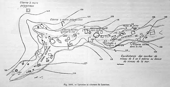 Les exploitations minières du Laurion disposent des puits verticaux les plus profonds de l'Antiquité. D'une section rectangulaire ou carrée de moins de deux mètres de côté, ils descendent parfois jusqu'à plus de cent mètres (119 mètres pour le plus profond)[N 36], mais plus généralement entre cinquante et soixante mètres. Ils sont taillés de façon très régulière, de manière que chaque face soit plane. Leur verticalité est étonnante : « le fil à plomb ne dénonce, dans les puits les plus profonds, qu'un écart insignifiant[110] ». Édouard Ardaillon estime à vingt mois le temps nécessaire pour que deux ouvriers foncent un puits de cent mètres[N 37].
