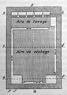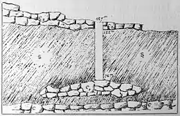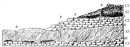 Les galeries étaient étroites (50 à 60 cm de largeur, 60 à 90 cm de hauteur), ce qui ne facilitait ni le travail et la circulation des mineurs, ni l'évacuation du minerai abattu. Quand les excavations étaient plus grandes, les ouvriers laissaient subsister des portions de roches pauvres en minerai qui servaient de piliers (ormos). On pouvait aussi, localement, avoir recours au soutènement par boisage, comme le démontrent nos sources littéraires et archéologiques[N 38], même si cela était loin d'être la règle : la faible largeur des galeries permettait le plus souvent de limiter les risques d'effondrement ; elle rendait en outre la progression plus rapide[N 39]. Les mineurs attaquaient le front de taille en creusant des mortaises de 12 cm de large sur toute la hauteur de la galerie. Au bout de cinq mortaises, l'ensemble de la galerie, large de 60 cm, avait progressé de la profondeur de ces mortaises. Un tel travail prenait environ dix heures, ce qui correspond au rythme de rotation des équipes, et à la capacité d'éclairage des lampes : Édouard Ardaillon en conclut qu'une telle organisation était délibérée car elle permettait au supérieur hiérarchique de constater la bonne marche du travail et de sanctionner éventuellement les mineurs trop peu performants[111]. Au bout d'un mois, la galerie s'était ainsi enfoncée de dix mètres[112].
