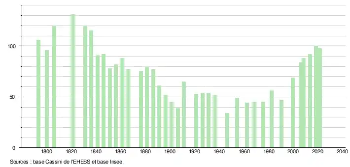 | L'évolution du nombre d'habitants est connue à travers les recensements de la population effectués dans la commune depuis 1793. Pour les communes de moins de 10 000 habitants, une enquête de recensement portant sur toute la population est réalisée tous les cinq ans, les populations légales des années intermédiaires étant quant à elles estimées par interpolation ou extrapolation[26]. Pour la commune, le premier recensement exhaustif entrant dans le cadre du nouveau dispositif a été réalisé en 2008[27]. En 2021, la commune comptait 98 habitants[Note 5], en augmentation de 1,03 % par rapport à 2015 (Hautes-Pyrénées : +1,04 %, France hors Mayotte : +1,84 %). |