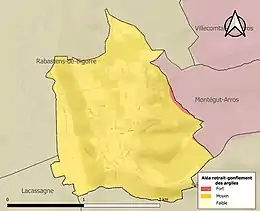 Le retrait-gonflement des sols argileux est susceptible d'engendrer des dommages importants aux bâtiments en cas d’alternance de périodes de sécheresse et de pluie. La totalité de la commune est en aléa moyen ou fort (44,5 % au niveau départemental et 48,5 % au niveau national). Sur les 49 bâtiments dénombrés sur la commune en 2019, 49 sont en aléa moyen ou fort, soit 100 %, à comparer aux 75 % au niveau départemental et 54 % au niveau national. Une cartographie de l'exposition du territoire national au retrait gonflement des sols argileux est disponible sur le site du BRGM[20],[Carte 3].