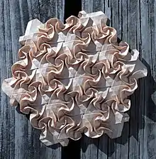 En origami, la tessellation consiste à créer des motifs répétés en relief par pliage[6]. Cette forme de l'origami fut mise au point dans les années 1960 par Shuzo Fujimoto, auteur de plusieurs ouvrages sur le sujet[7]. Si la tessellation consiste à créer des origamis géométriques en deux dimensions, certains origamistes intègrent dans leurs créations des motifs en tessellation dans des pliages réalistes, pour figurer, par exemple, les écailles de la carapace de la tortue ou du pangolin (chez Éric Joisel), ou du poisson (chez Robert J. Lang, pour sa carpe Koi[8])[7].