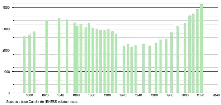 L'évolution du nombre d'habitants est connue à travers les recensements de la population effectués dans la commune depuis 1793. Pour les communes de moins de 10 000 habitants, une enquête de recensement portant sur toute la population est réalisée tous les cinq ans, les populations légales des années intermédiaires étant quant à elles estimées par interpolation ou extrapolation[32]. Pour la commune, le premier recensement exhaustif entrant dans le cadre du nouveau dispositif a été réalisé en 2005[33].