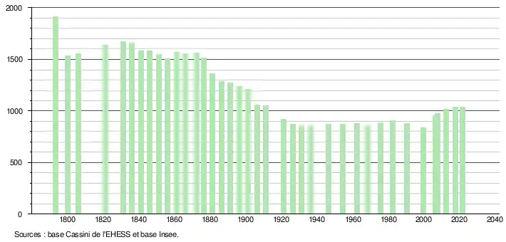 | L'évolution du nombre d'habitants est connue à travers les recensements de la population effectués dans la commune depuis 1793. Pour les communes de moins de 10 000 habitants, une enquête de recensement portant sur toute la population est réalisée tous les cinq ans, les populations légales des années intermédiaires étant quant à elles estimées par interpolation ou extrapolation[39]. Pour la commune, le premier recensement exhaustif entrant dans le cadre du nouveau dispositif a été réalisé en 2007[40]. En 2021, la commune comptait 1 039 habitants[Note 9], en augmentation de 1,76 % par rapport à 2015 (Tarn-et-Garonne : +3,17 %, France hors Mayotte : +1,84 %). |