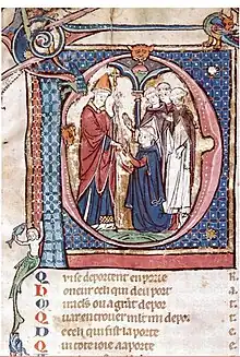 Ce manuscrit[7] est attribué à Jean de Senlis (pour le texte) et à Maître Fauvel pour les enluminures ; il date de 1327 et est composé de 189 folios ; le manuscrit est la deuxième partie d'un ouvrage dont la première partie, un légendier, est à la BnF, cote Français 183[8].