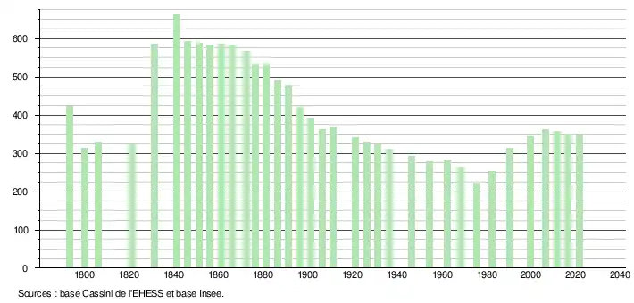 | L'évolution du nombre d'habitants est connue à travers les recensements de la population effectués dans la commune depuis 1793. Pour les communes de moins de 10 000 habitants, une enquête de recensement portant sur toute la population est réalisée tous les cinq ans, les populations légales des années intermédiaires étant quant à elles estimées par interpolation ou extrapolation[24]. Pour la commune, le premier recensement exhaustif entrant dans le cadre du nouveau dispositif a été réalisé en 2006[25]. En 2021, la commune comptait 349 habitants[Note 3], en diminution de 1,13 % par rapport à 2015 (Gers : +0,79 %, France hors Mayotte : +1,84 %). |