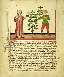 Le remède est décrit dans les textes littéraires, de façon fort simple : potion herbée (« boivre »), boîte d'onguent (« oignement »), « éléctuaire » (loch) fournis par l'herbier ou apothicaire.Usage inconnu pour les chirurgiens, de lunettes, de divers instruments, charpie, coton et fils de soie, alcool, bandages herniaires, aimants… L’anesthésie n'existe pas sinon pour les chevaux sous la forme d'« opiat »[18] Le médecin disposait d'une pharmacopée très développée depuis des siècles : les livres dans lesquels le mire médecin trouvait des recettes de médicaments, étaient appelés « Antidotarium » ou encore Dispensatorium : celui de Mésué, médecin de Bagdad vers l'an 800, l’antidotarium magnus de l'École de médecine de Salerne, l'Antidotaire Nicolas, le Liber iste, le Pomum ambre, le Dynaméron, de Nicolas Myrepsos (nom signifiant « apothicaire », dans la Septante), de plus de 1 200 recettes. Il y avait aussi les recueils de simples, herbes et végétaux, comme celui d'Hildegarde de Bingen, d'Albert Le Grand ou le Livre des simples médecines, issu du Circa instans de Plaetarius, sans compter les copies des livres de Dioscoride. Ces médicaments étaient donc de nature variée[Note 4] et issus d'une pharmacopée très développée : Guy de Chauliac cite 160 drogues dans son Glossaire. Pour la boisson, elle se composait de juleps, sirops, électuaires, lochs à base d’épices et d'herbes, ainsi que pour les cataplasmes de plantes broyées, plantes médicinales simples occidentales comme celles du Capitulaire de Villis, et bien d'autres, comme la mauve, la bétoine, le thym, la réglisse, l'armoise, la sauge (de salvare, guérir) et le plantain du Dit de l'Herberie de Rutebeuf, etc.), ou plantes orientales et égyptiennes (noix de muscade, myrrhe, croton, opium, grenade, ricin, cannelle, etc.), les fruits comme la prune myrobolans et les confections comme le diaprunus, de miel (la cire), ingrédient indispensable et de sucre rosat, pour la fabrication des électuaires dont le plus célèbre fut la thériaque, ou de l’oxymel des arabes, et dont une cuillerée servait aux gargarismes, aux suppositoires et à d’autres confections. Les vins aromatiques, les élixirs, les teintures, les oneolés, à base de vin de vinaigre d’alcool, pour les formes liquides ; pilules (aurées et sine quibus, à base d’aloès, stiptices ou astringentes contre la diarrhée, etc.) et comprimés très répandus ; de cataplasmes et d’onguents, comme l’« onguent blanc Égypte » ; Les minéraux comme l’antimoine et le lapis-lazuli, les métaux (plomb, arsenic, fer) et formaient la base de nombreux médicaments, ainsi que les graisses animales, les cornes, les os, les minéraux d’animaux les plus divers comme la seiche, le castoreum, le corail, la toile d'araignée, les coquillages, les sels (alun, salpêtre, borax, etc.). Le tout était mélangé à des épices diverses, girofle, cannelle, muscade, pour la conservation des confections.