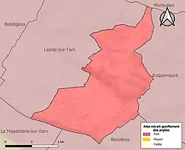 Le retrait-gonflement des sols argileux est susceptible d'engendrer des dommages importants aux bâtiments en cas d’alternance de périodes de sécheresse et de pluie. La totalité de la commune est en aléa moyen ou fort (88,8 % au niveau départemental et 48,5 % au niveau national). Sur les 400 bâtiments dénombrés sur la commune en 2019, 400 sont en aléa moyen ou fort, soit 100 %, à comparer aux 98 % au niveau départemental et 54 % au niveau national. Une cartographie de l'exposition du territoire national au retrait gonflement des sols argileux est disponible sur le site du BRGM[27],[Carte 3].