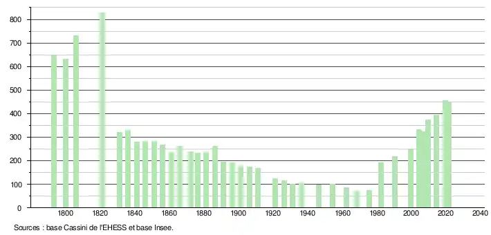 L'évolution du nombre d'habitants est connue à travers les recensements de la population effectués dans la commune depuis 1793. Pour les communes de moins de 10 000 habitants, une enquête de recensement portant sur toute la population est réalisée tous les cinq ans, les populations légales des années intermédiaires étant quant à elles estimées par interpolation ou extrapolation[16]. Pour la commune, le premier recensement exhaustif entrant dans le cadre du nouveau dispositif a été réalisé en 2004[17].