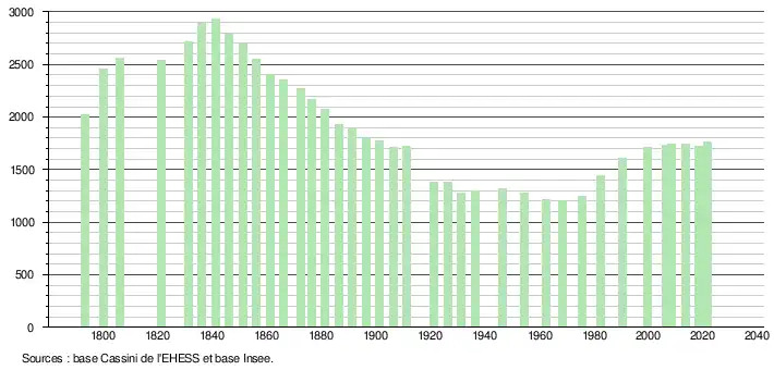 - Population municipale légale en vigueur au 1er janvier 2024, millésimée 2021, définie dans les limites territoriales en vigueur au 1er janvier 2023, date de référence statistique : 1er janvier 2021.