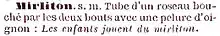 « TROMPETTE DE CANNE. C’est le roseau fendu, servant de jouet aux enfants de la campagne ; ce roseau est évidé, à l’exception d’une petite membrane, qui résonne. Cet instrument n’est autre que le mirliton primitif. »