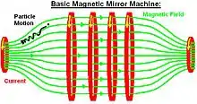 Dans un miroir magnétique classique, une configuration d'électroaimants est utilisée pour créer une zone avec une densité croissante de lignes de champ magnétique aux deux extrémités d'un volume de confinement. Les particules qui s'approchent d'une extrémité sont soumises à une force de plus en plus importante, qui finit par leur faire rebrousser chemin et à les renvoyer dans la zone de confinement[1]. Cet effet miroir ne se produit que pour les particules dont la vitesse et l'angle d'approche se situe dans des plages limitées. Les particules se trouvant en dehors de ces limites s'échappent de la zone de confinement, ce qui constitue des fuites intrinsèques au miroir.