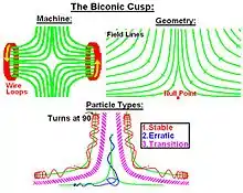 Si l'un des pôles de la bouteille magnétique est inversé, elle devient une cuspide biconique, qui peut également confiner des particules chargées[40],[41],[42]. Les cuspides biconiques ont d'abord été étudiées par Harold Grad à l'Institut des sciences mathématiques de Courant. Des études ont révélé la présence de différents types de particules à l'intérieur d'une cuspide biconique. L'approche la plus financée est celle du réacteur à fusion compact qui a été supportée par Lockheed-Martin depuis 2007[43].
