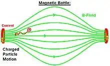 Une bouteille magnétique est constituée de deux miroirs magnétiques placés l'un à côté de l'autre. Par exemple, deux bobines électriques parallèles séparées par une petite distance et transportant le même courant dans le même sens produiront des lignes de champ qui ont la forme d'une bouteille dans l'espace qui les sépare. Contrairement à la machine à miroir complète qui avait généralement de nombreux grands anneaux de courant entourant la région centrale du champ magnétique, la bouteille n'a généralement que deux anneaux de courant. Le champ magnétique est plus intense au niveau des deux bobines qu'au centre du dispositif, et les particules proches de chacune des bobines subissent une force magnétique qui les repoussent vers le centre de la région. Les particules ayant des vitesses appropriées se déplacent en spirale en faisant des allers-retours répétés entre les deux extrémités de la région. Des bouteilles magnétiques peuvent donc être utilisées pour piéger temporairement des particules chargées. Il est plus facile de piéger des électrons que des ions, car les électrons sont beaucoup plus légers[39]. Cette technique est utilisée pour confiner les plasmas de haute énergie dans les expériences de fusion.