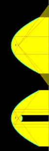 Représentation du miroir dans les conditions du stigmatisme approché : on dit que le miroir est dans les conditions de Gauss si les rayons incidents sont paraxiaux (autrement dit, s'ils frappent le miroir très près du sommet en faisant un angle très petit avec l'axe du miroir).