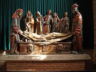 Le XVe siècle voit se développer des représentations assez stéréotypées, où le corps du Christ est allongé sur son linceul que tiennent Nicodème (aux pieds) et Joseph d'Arimathie (à la tête du Christ)[14]. La Vierge, saint Jean et une ou plusieurs saintes femmes, parfois des soldats, assistent à la scène ou y participent[15]. Ces nombreuses Mise au tombeau sculptées conservées dans les églises sont souvent désignées par le nom de « Saint-Sépulcre » ou simplement le « Sépulcre »[16].