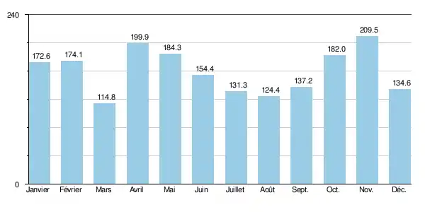 | Précipitations (mm) | 172,6 | 174,1 | 114,8 | 199,9 | 184,3 | 154,4 | 131,3 | 124,4 | 137,2 | 182 | 209,5 | 134,6 | 1 919,1 |