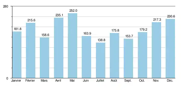 | Précipitations (mm) | 181,8 | 215,6 | 158,6 | 235,1 | 252 | 163,9 | 138,8 | 175,8 | 153,7 | 179,2 | 217,3 | 230,6 | 2 302,4 |
