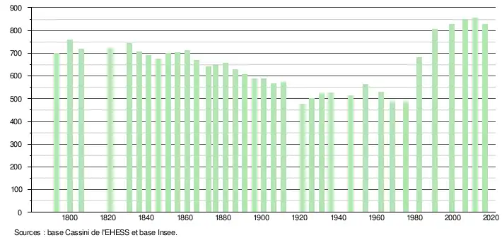 L'évolution du nombre d'habitants est connue à travers les recensements de la population effectués dans la commune depuis 1793. Pour les communes de moins de 10 000 habitants, une enquête de recensement portant sur toute la population est réalisée tous les cinq ans, les populations légales des années intermédiaires étant quant à elles estimées par interpolation ou extrapolation[2]. Pour la commune, le premier recensement exhaustif entrant dans le cadre du nouveau dispositif a été réalisé en 2006[3].