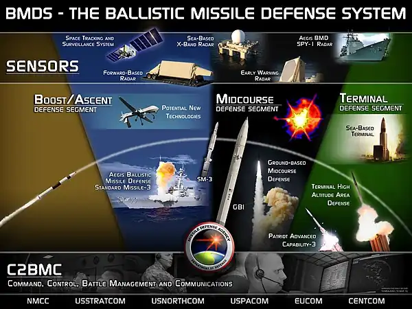 • Le Command and Control, Battle Management and Communications (C2BMC) est le programme permettant d'intégrer tous les composants du système de défense anti-missile (commandement, télécommunications, test,...)[13].