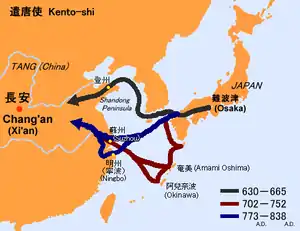 Les missions impériales auprès de la dynastie Tang (遣唐使, Kentō-shi) sont les mieux connues (13 au total) ; elles se terminent en 894. À cette époque, des ambassadeurs sont nommés et sur le point de partir pour la Chine. Cependant, la mission est interrompue par l'empereur Uda en 894 (Kanpyō 6, 8e mois) en raison des rapports de conditions instables en Chine[5]. Des conseils convaincants de la part de Sugawara no Michizane convainquent l'empereur de prendre cette décision[6].