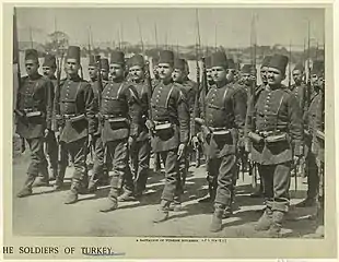Un autre aspect de la coopération germano-ottomane est l'envoi de 100 000 soldats ottomans sur les fronts d'Europe de l'Est, de Roumanie et des Balkans : leurs alliés allemands et austro-hongrois leur assurent un meilleur service de ravitaillement, soins médicaux et équipement que celui dont ils bénéficiaient dans leur patrie[36]. Ces unités (plusieurs divisions formant les VIe, XVe et XXe corps ottomans) reçoivent un équipement et une formation alignés sur ceux des troupes d'assaut (Sturmtruppen) allemandes[37].