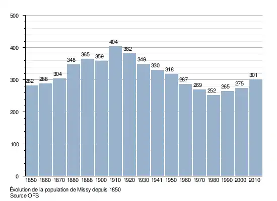 La population de Missy s’élève à 220 habitants en 1764[12], 224 en 1798[12], 270 en 1837[10], 282 en 1850, puis 404 en 1910. Après que le nombre d’habitants a diminué jusqu’à 252 en 1980, un faible accroissement de la population a été enregistré depuis lors. Le graphique suivant résume l'évolution de la population de Missy entre 1850 et 2010[13] :