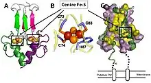 MitoNEET est un dimère ancré à la membrane externe mitochondriale par son extrémité N-terminale. Elle possède un centre [2Fe-2S] par monomère, situé dans le cytosol. Chaque centre [2Fe-2S] est coordonné par trois cystéines (C72, C74 et C83) et une histidine (H87). Cette coordination atypique rend son centre Fe-S relativement labile (figure 2).