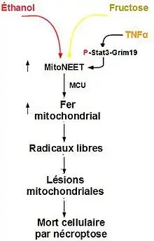 Le fructose et l'éthanol sont métabolisés principalement dans le foie. Le traitement par TNFα induit la translocation d'un complexe Stat3-Grim-19 à la mitochondrie, qui se lie à mitoNEET et favorise la libération rapide de son centre 2Fe-2S, ce qui provoque une accumulation du fer mitochondrial. L'augmentation spectaculaire du fer mitochondrial provoque une forte augmentation dans la formation d'espèces réactives de l'oxygène, ce qui entraîne des lésions mitochondriales et la mort cellulaire (notamment par nécroptose).