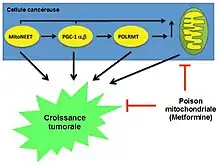 MitoNEET, PGC-1 (notamment les isoformes α et β) et POLRMT induisent tous la biogenèse mitochondriale et promeuvent efficacement la croissance tumorale, lorsqu'elle est exprimée dans les cellules cancéreuses. Ainsi, l'utilisation thérapeutique des inhibiteurs mitochondriaux ou « poisons » (tels que la metformine) va inhiber la croissance tumorale. Surtout, de nombreuses études cliniques ont montré que la metformine (un inhibiteur du complexe I mitochondrial) empêche l'apparition de presque tous les types de cancers humains chez les patients diabétiques.