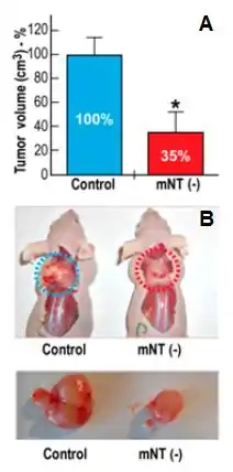 MitoNEET est requise pour la croissance tumorale. Les cellules du cancer du sein avec ou sans expression de mitoNEET (mNT -/-) ont été injectées par voie sous-cutanée dans le dos de souris et la croissance tumorale a été contrôlée au fil du temps. (A) Réduction du volume tumoral moyen exprimé en pourcentage du témoin dans les cellules mNT -/-. (B) Images de tumeurs représentatives de chaque groupe obtenues à la fin de l'expérience.