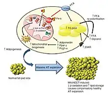 Il y a des conséquences métaboliques systémiques résultant d'une perturbation mitochondriale induite par la protéine mitoNEET. La protéine mitoNEET affecte la teneur en fer mitochondrial, qui peut contribuer à la baisse de la β-oxydation et améliore l'absorption des acides gras par la signalisation par le récepteur CD36. La fonction mitochondriale compromise déclenche donc une régulation positive compensatoire de l'adipogenèse, de la signalisation adrénergique par le récepteur adrénergique β-3 et la biogenèse mitochondriale. La diminution cellulaire dans l'activité mitochondriale améliore l’influx des lipides dans la cellule. L'incapacité à utiliser ces lipides efficacement dans les mitochondries augmente les substrats dans les groupements de triglycéride (TG). Par conséquent, les taux β-oxydation faibles, l'activité PPAR-γ élevé et les taux d'adiponectine augmentés sont accompagnés par le stockage des lipides en excès dans le tissu adipeux (AT) en expansion.