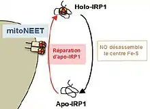 L’aconitase cytosolique (ou Holo-IRP1) perd son centre Fe-S à la suite d'un stress NO qui devient apo-IRP1. MitoNEET qui est localisée sur la membrane externe mitochondriale transfère son centre Fe-S à l’apo-IRP1 qui est réactivé en aconitase cytosolique[1],[2],[3],[4],[5],[6],[7],[8],[9],[10],[11],[12],[13],[14].