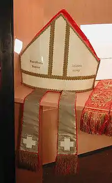 Mitre de Jacques de Vitry en parchemin et en soie (1e moitié du XIIIe siècle), conservée dans le trésor d'Hugo d'Oignies à Namur.