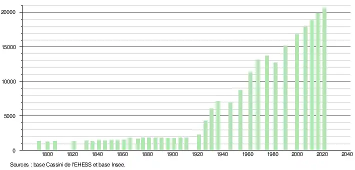- Par convention dans Wikipédia, le principe a été retenu de n’afficher dans le tableau des recensements et le graphique, pour les populations légales postérieures à 1999, que les populations correspondant à une enquête exhaustive de recensement pour les communes de moins de 10 000 habitants, et que les populations des années 2006, 2011, 2016, etc. pour les communes de plus de 10 000 habitants, ainsi que la dernière population légale publiée par l’Insee pour l'ensemble des communes.
