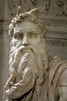 La statue figure Moïse portant des cornes, cette représentation a fait débat également sur une mauvaise interprétation des textes bibliques sur une aura ou des rayons[3].