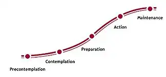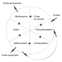 Selon Prochaska et Di Clemente (1982), les personnes aux prises avec un problème de dépendance passeraient par une série de stades de changement : précontemplation, contemplation, détermination, action, maintien, rechute[1].